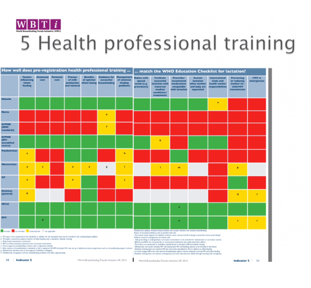 The WBTi report in 2016 (see Indicator 5 in Part 1 of the WBTi UK report for the above table, and Indicator 5 in Part 2 for the detailed findings for each UK health profession) showed that for most health professions in the UK, the coverage of infant feeding in pre-registration training was inadequate. In some case only broad standards are given and the individual universities develop their own curricula.