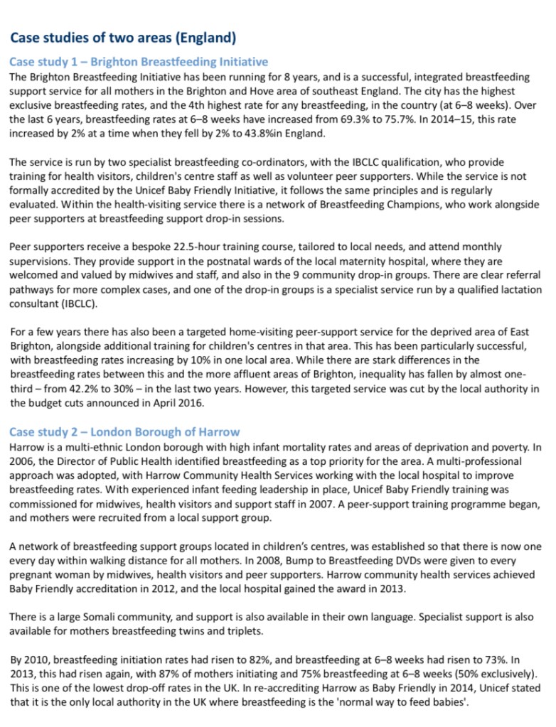 “We recognise the concerns raised in the World Breastfeeding Trends Initiative’s United Kingdom report and are considering the recommendations” and “we know through the report that England scores poorly, and we want to change that.” See Column 260 in the Hansard report of the debate.